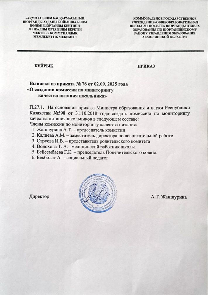 «Мектеп оқушыларының тамақтану сапасын мониторингтеу комиссиясын құру туралы» 2025-2026 оқу жылына арналған бұйрық.