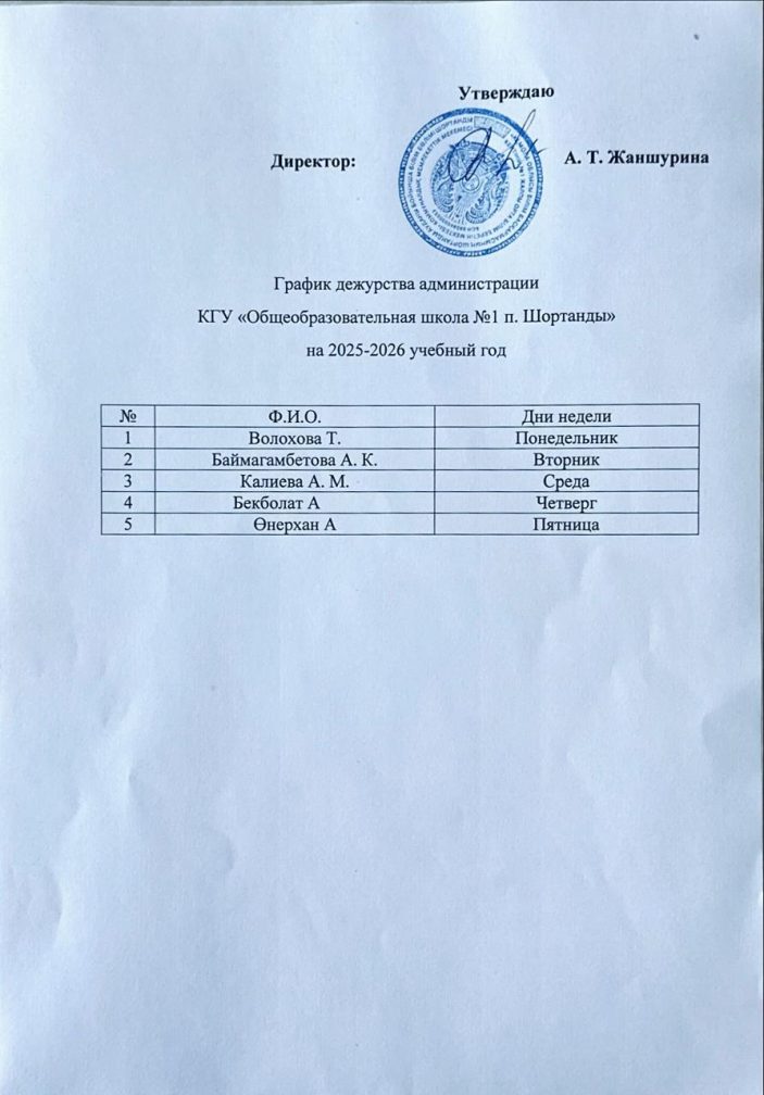 Әкімшілік кезекшілік кестесі 2025–2026 оқу жылы үшін.