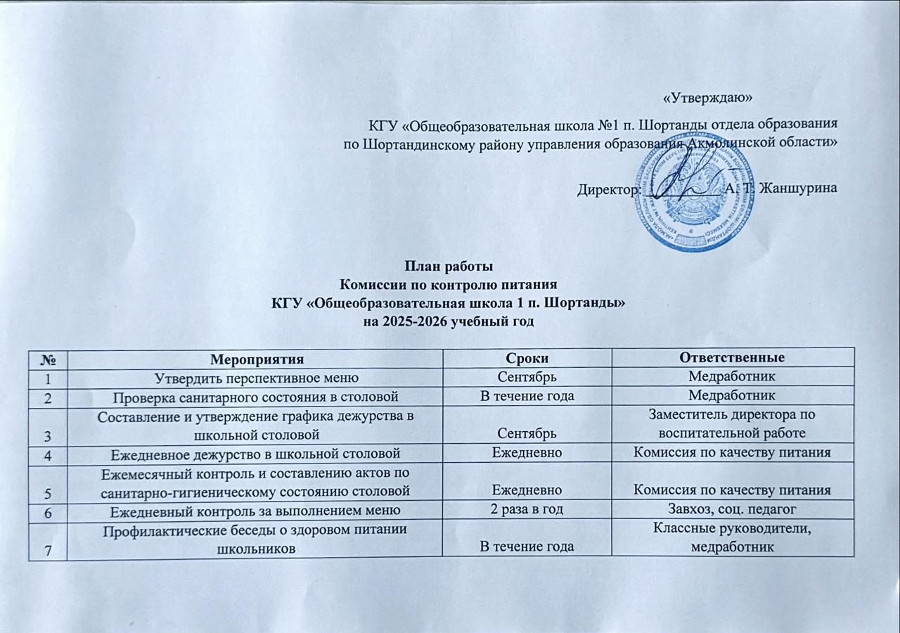 2025–2026 оқу жылы үшін тамақтануды бақылау комиссиясының жұмыс жоспары.